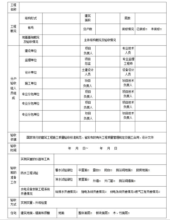 成、驗收依據、驗收時間、驗收前的準備工作、驗收方式、住宅套內實體